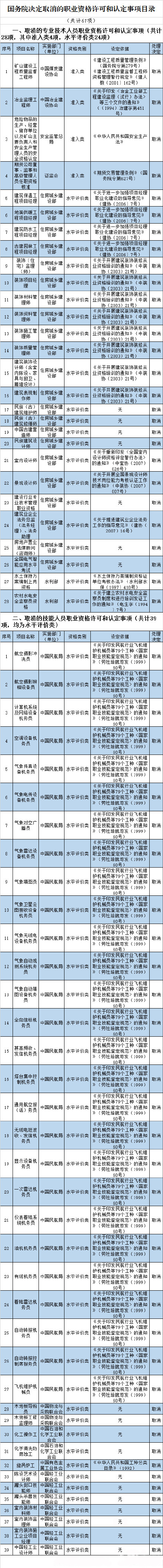 河南省教育網(wǎng)訊,近日國務(wù)院發(fā)布國發(fā)國發(fā)〔2015〕11號國務(wù)院關(guān)于取消和調(diào)整一批行政審批項目等事項的決定。文件說,經(jīng)研究論證,國務(wù)院決定,取消和下放90項行政審批項目,取消67項職業(yè)資格許可和認(rèn)定事項,取消10項評比達(dá)標(biāo)表彰項目,將21項工商登記前置審批事項改為后置審批,保留34項工商登記前置審批事項。同時,建議取消和下放18項依據(jù)有關(guān)法律設(shè)立的行政審批和職業(yè)資格許可認(rèn)定事項,將5項依據(jù)有關(guān)法律設(shè)立的工商登記前置審批事項改為后置審批,國務(wù)院將依照法定程序提請全國人民代表大會常務(wù)委員會修訂相關(guān)法律規(guī)定。其中取消的職業(yè)資格許可和認(rèn)定事項,包括礦山建設(shè)工程質(zhì)量監(jiān)督工程師、冶金監(jiān)理工程師、建筑裝飾設(shè)計師、室內(nèi)設(shè)計師、景觀設(shè)計師、氣象填圖員、化工操作工、中國輕工業(yè)設(shè)計師等。如下圖所示:圖片來自網(wǎng)絡(luò)。