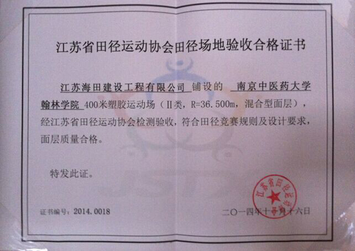 熱烈祝賀我公司承建的翰林學(xué)院400米塑膠運(yùn)動(dòng)場(chǎng)被評(píng)為“江蘇省合格田徑場(chǎng)地(Ⅱ)”